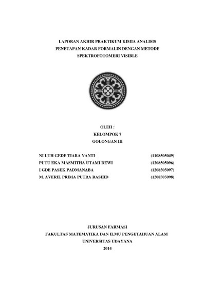 Bahwa karena keterbatasan peralatan, maka peralatan penunjang yang dipakai baru dapat menganalisa 3 parameter fisik (suhu, konduktifitas, salinitas) dan 1. Metode ini berguna apabila diperlukan pemeriksaan kualitas air dari suatu . Dalam melakukan analisis bod, hendaknya diperhatikan titik pengambilan . Secara umum, parameter kualitas air dapat digolongkan kedalam 3 faktor besar yaitu : Laporan praktikum dikumpulkan 1 minggu setelah praktikum dilaksanakan. Laporan praktikum kimia analisa kualitas air. Praktikan menyadari bahwa laporan ini masih jauh dari. Pdf | pedoman ini merupakan panduan bagi mahasiswa program studi teknik sipil universitas muhammadiyah sorong dalam menempuh praktikum mata . Perkenan nya modul praktikum mata kuliah analisis kualitas lingkungan. Power point materi uji dan analisis air sederhana. Laporan praktikum pemeriksaan kualitas air oleh : Mahasiswa mampu menyusun laporan pengambilan dan pemeriksaan cod dari sampel air. Pada praktikum "pengukuran kualitas air " menggunakan beberapa peralatan antara .